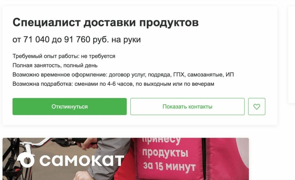 Все было бы очень гладко, если бы «Самокат» в своем же объявлении на сайте для поиска сотрудников не предлагал бы астраханцам зарплату от 71 040 до 91 760 рублей на руки.