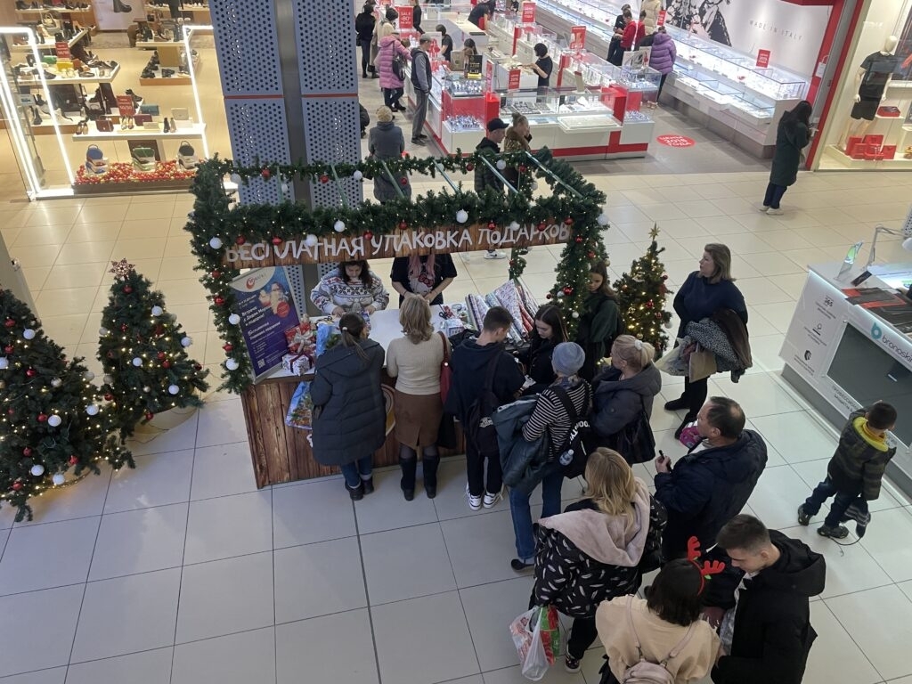Очередь из астраханцев и гостей города выстроилась перед киоском с бесплатной упаковкой подарков. На кадрах видно, что количество народа превышает десять человек. Вместе с этим, магазин с украшениями также оказался полон покупателей.