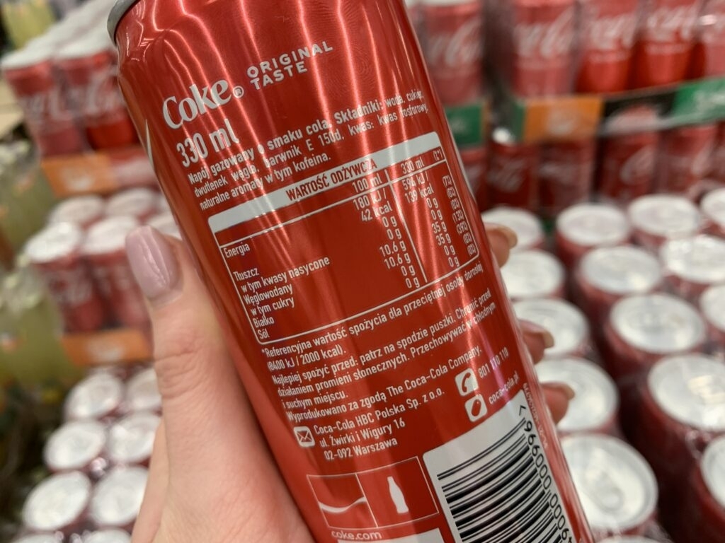 Примечательно, что на всем известной красной упаковке нет ни одного русского слова. Вся информация на задней стороны банки написана на польском. И, если в прошлый раз на пластиковой бутылке была наклейка с российским текстом, то в это раз она отсутсвует на некоторых банках.