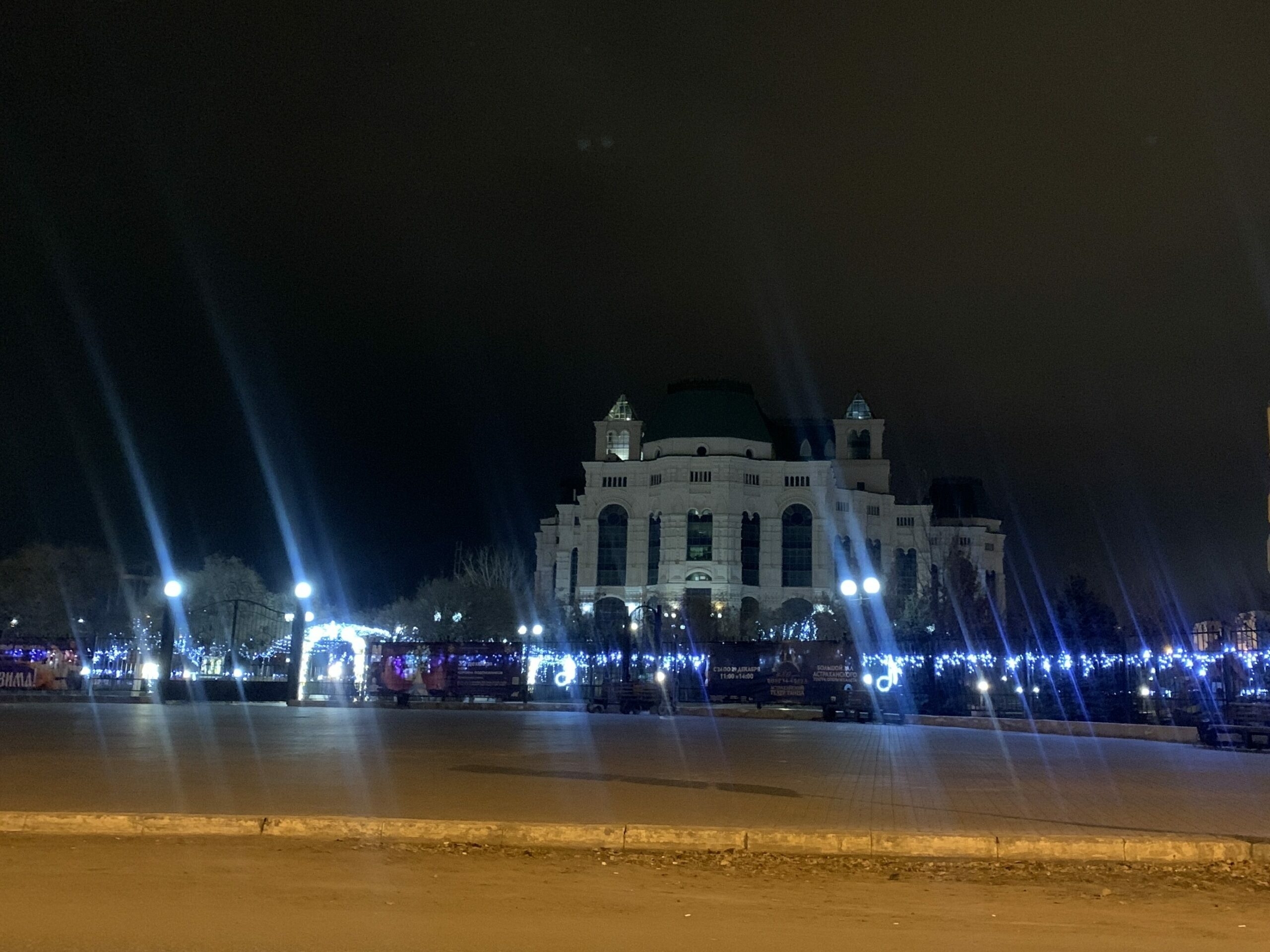 Вместе с этим, по-новогоднему засиял Астраханский театр оперы и балета на улице Анри Барбюса. Забор культурного учреждения украсили синими огнями, на ограждении также появились светящиеся фигуры.