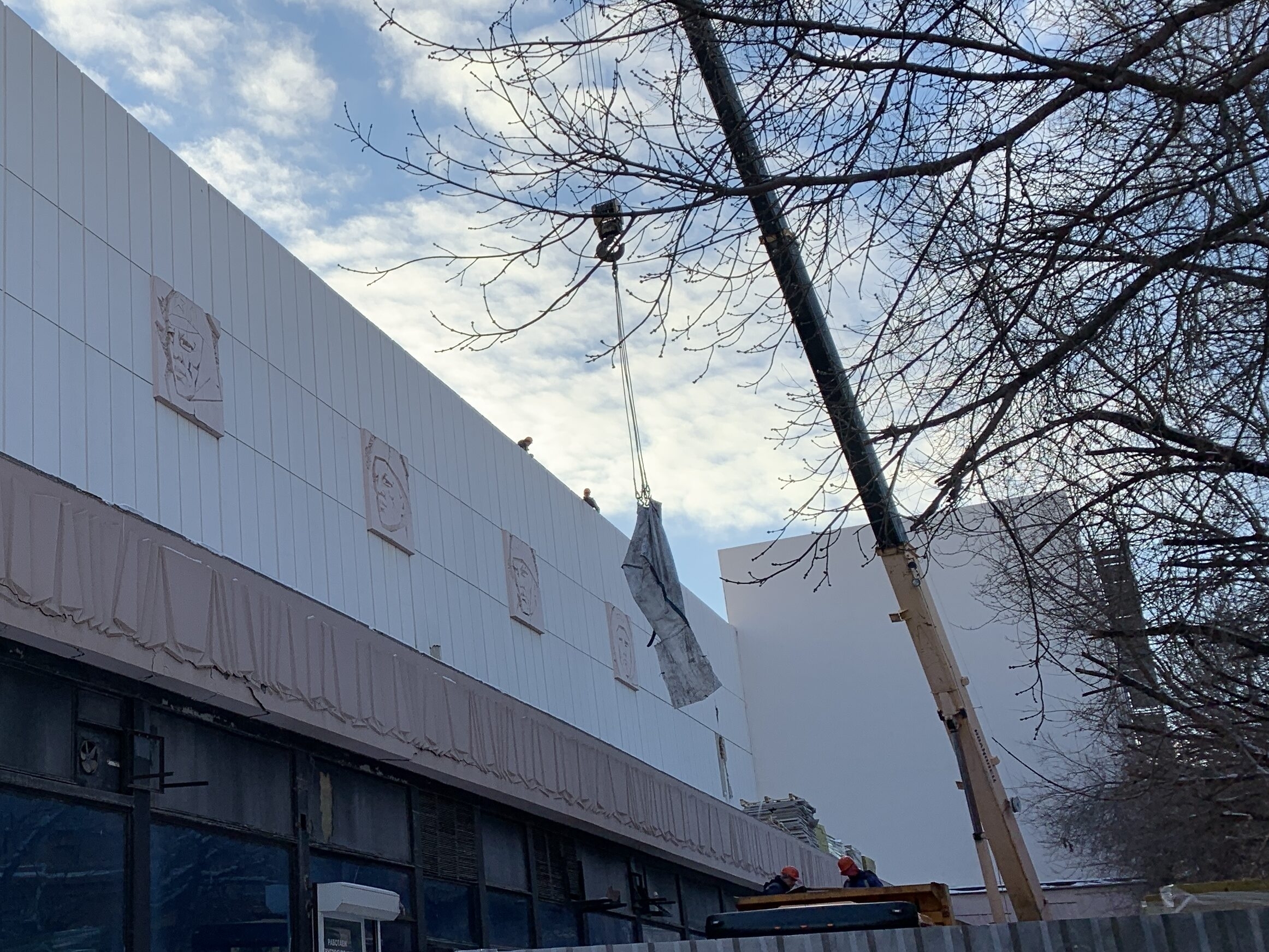 Вместе с фигурами четко виден кран, который является не иначе как «символом будущего» кинотеатра. Спецтехника опускает тару с использованными стройматериалами. На крыше лежит «батарея», предположительно, упаковок со шлакватой.