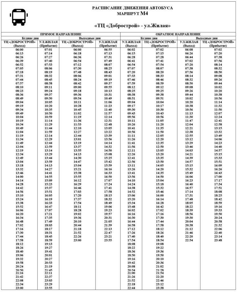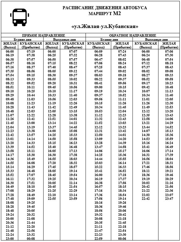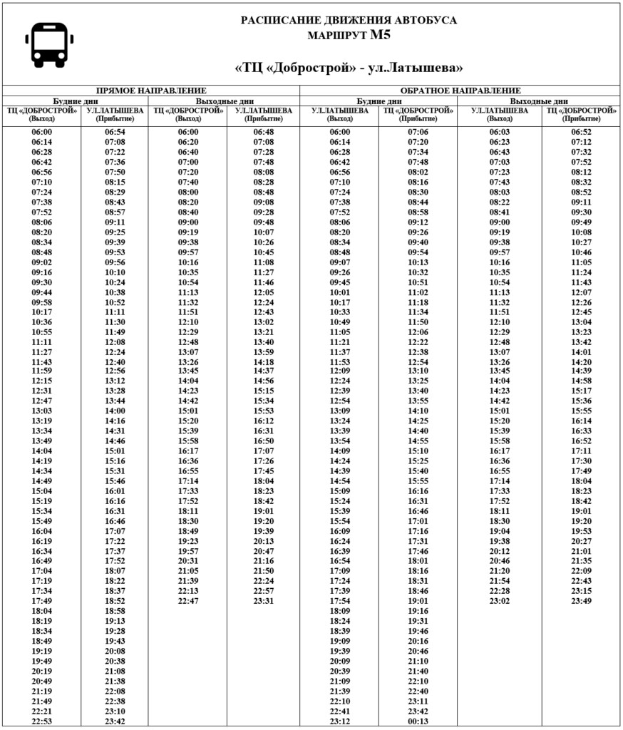 В расписании отметили разницу в работе автобусов с литерой «М» в выходные и будние дни. Пассажиры могут посмотреть точное время движения в прямом и обратном направлении.