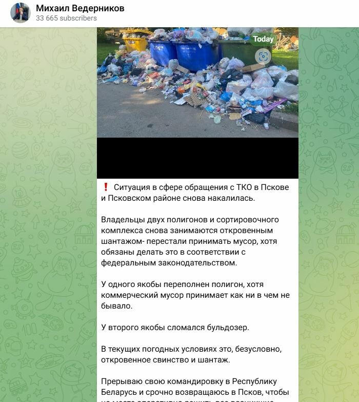 «Ситуация в сфере обращения с ТКО в Пскове и Псковском районе снова накалилась.Владельцы двух полигонов и сортировочного комплекса снова занимаются откровенным шантажом — перестали принимать мусор, хотя обязаны делать это в соответствии с федеральным законодательством», — сообщил в своем телеграмм-канале Михаил Ведерников.