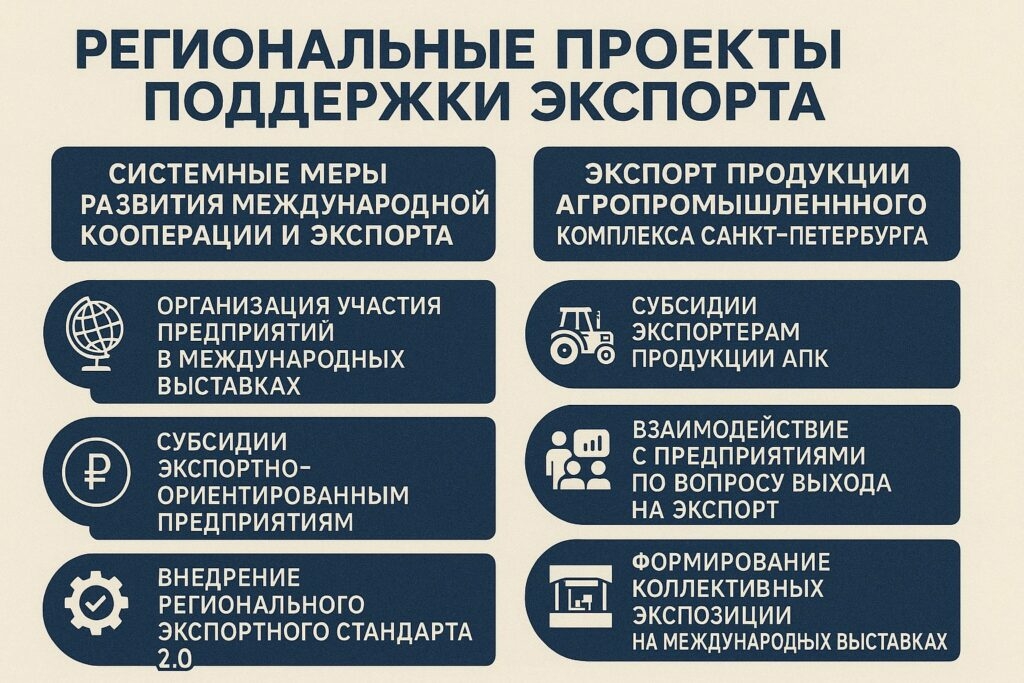 Чтобы реализовать поставленные федеральным правительством цели, в Санкт-Петербурге запустили два региональных проекта. Первый – Системные меры развития международной кооперации и экспорта до 2030 года с увеличением объемов внешнеторговых сделок. Второй – Экспорт продукции агропромышленного комплекса города федерального значения Санкт‑Петербурга, направленный на повышение к 2030 году экспорта продукции агропромышленного комплекса не менее чем в полтора раза по сравнению с уровнем 2021 года.