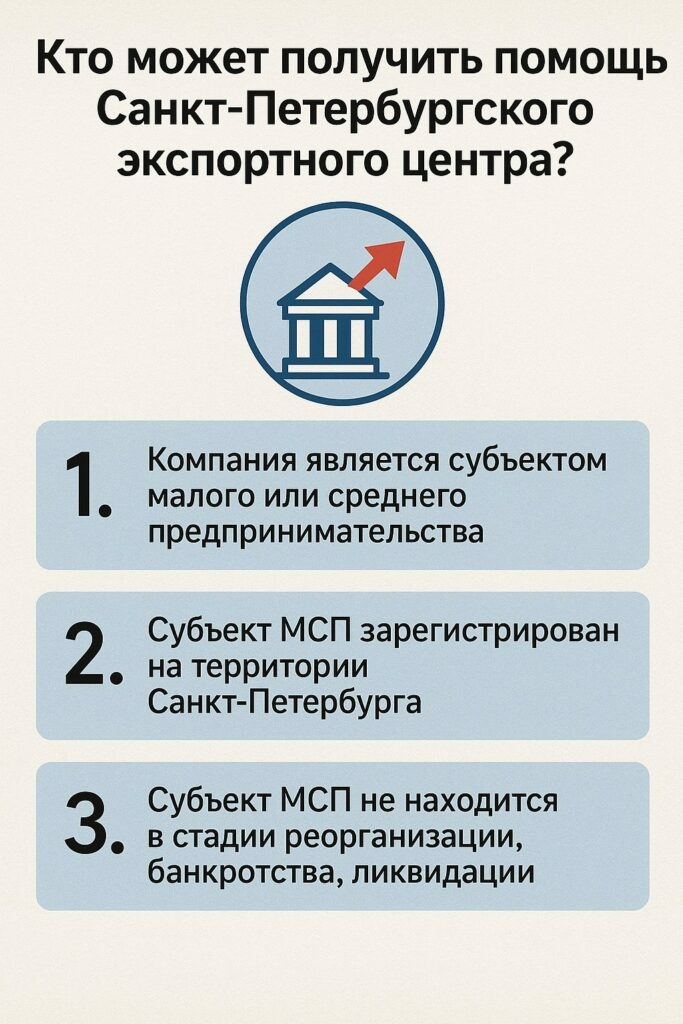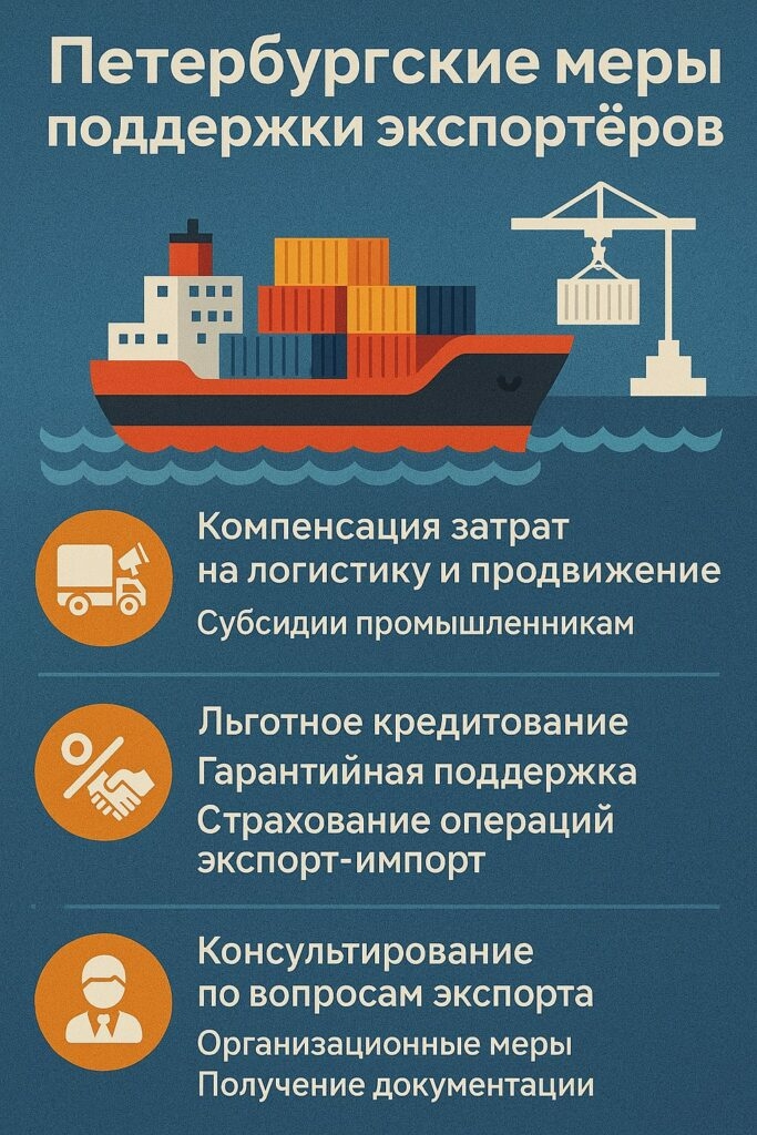 Власти Санкт-Петербурга уделяют особенное внимание поддержке предприятий, нацеленных на экспорт продукции и технологий на внешние рынки. Именно поэтому еще в 2019 году была создана АНО «Санкт-Петербургский центр поддержки экспорта». Организация нацелена на оказание информационной, консультационной и организационной поддержки компаниям города при выходе на международные рынки.