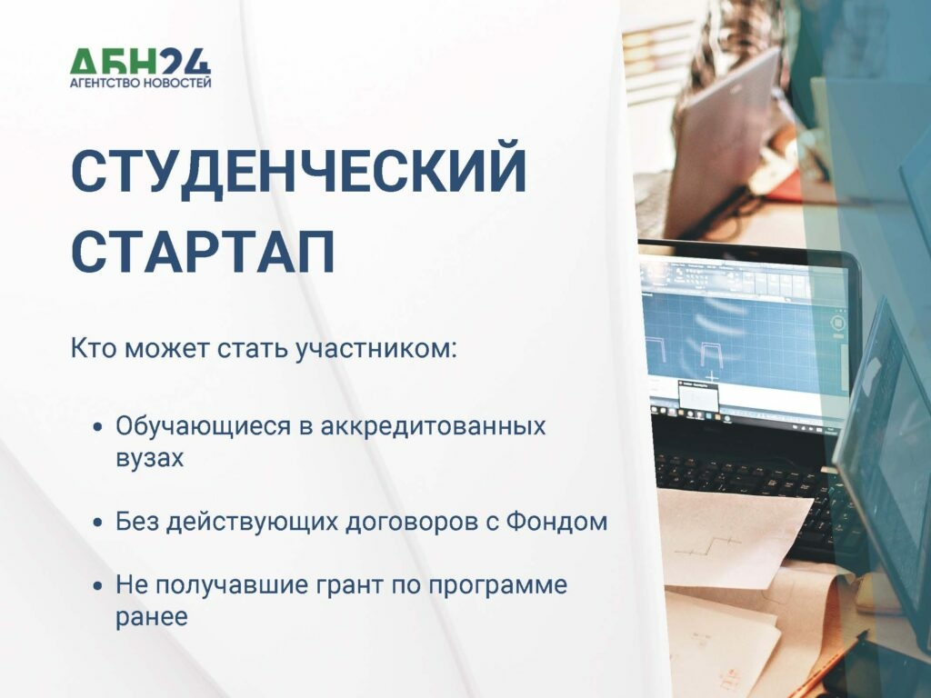 Участвовать в «Студенческом стартапе» могут физические лица, обучающиеся по образовательным программам высшего образования, имеющие аккредитацию Федеральной службы по надзору в сфере образования и науки, не имеющие действующих договоров с Фондом (не являющиеся на момент подачи заявки на участие в данном конкурсе получателями гранта, руководителями организаций — получателей гранта или научными руководителями проектов) и не получавшие ранее грант по программе. Он выдается по направлениям: цифровые технологии, медицина и технологии здоровьесбережения, новые материалы и химические технологии, новые приборы и интеллектуальные производственные технологии, биотехнологии, ресурсосберегающая энергетика, креативные индустрии.