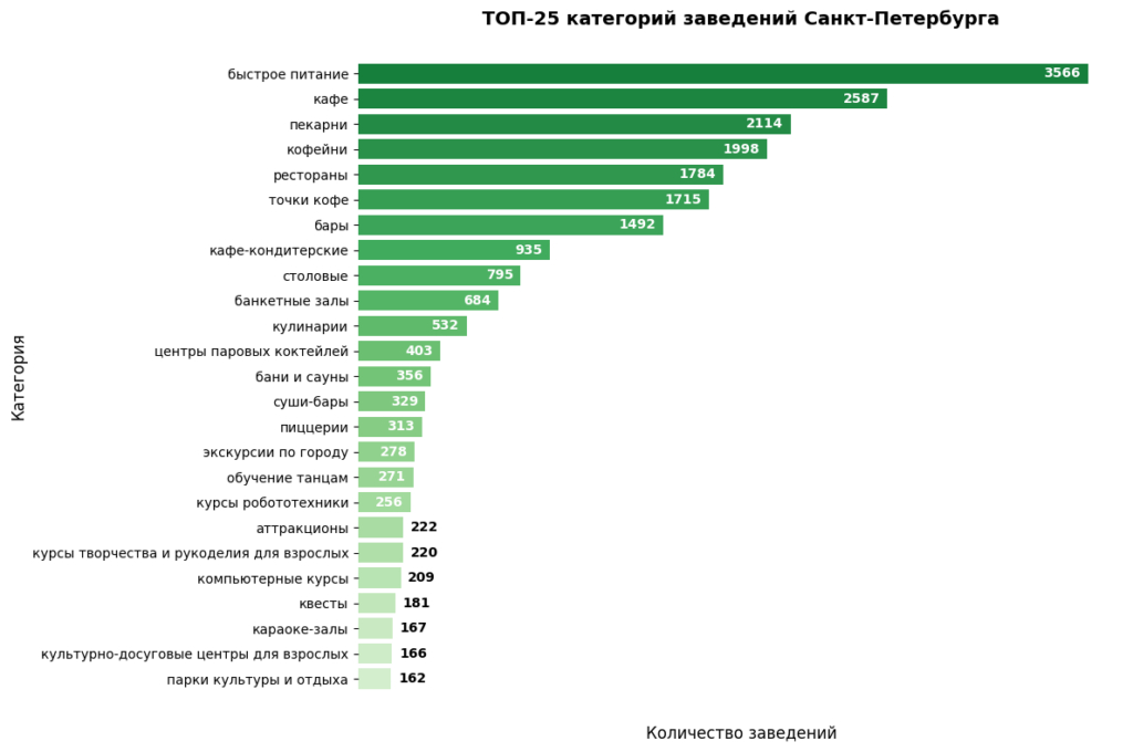 ТОП-25 категорий заведений Санкт-Петербурга почти полностью сформирован заведениями питания с выраженным перекосом в пользу быстрых и кофейных форматов, а развлекательные, образовательные и культурно-досуговые категории занимают существенно меньшую долю по количеству точек.