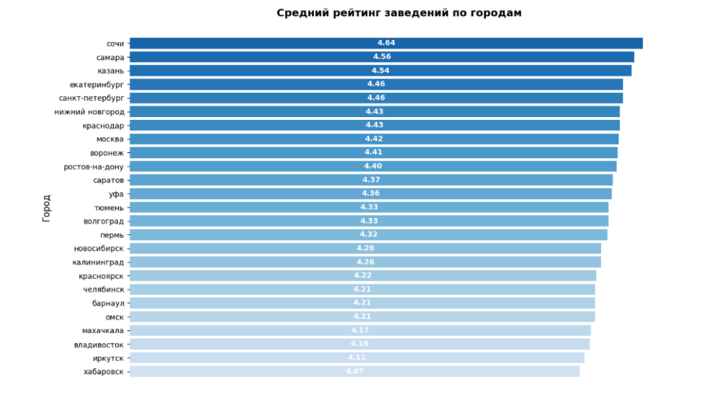 В нижней части рейтинга — Махачкала (4.17) и Хабаровск (4.07). Тем не менее отрыв между лидерами и аутсайдерами составляет всего 0.6 балла, что показывает высокую равномерность сервисных стандартов по стране.