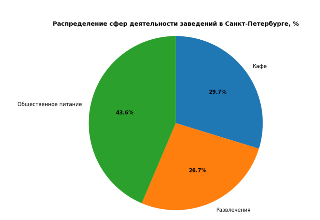 В Санкт-Петербурге структура заведений смещена в сторону общественного питания: на него приходится 43,6% всех точек, тогда как кафе занимают еще 29,7% и вместе с общественным питанием формируют около 73% рынка. Развлекательные форматы составляют 26,7%, то есть заметный, но меньший по объему сегмент по сравнению с заведениями питания.