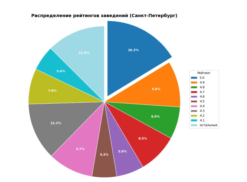В Санкт-Петербурге около 87% заведений имеют оценки от 4,1 до 5, причем на долю рейтингов. Наиболее распространен рейтинг у заведений в городе = 5,0 (16,3%), далее следуют 4,3 (12,2%), 4,4 (9,7%) и 4,9 (9,8%), тогда как доля прочих, менее высоких рейтингов суммарно составляет лишь около 12,5%.