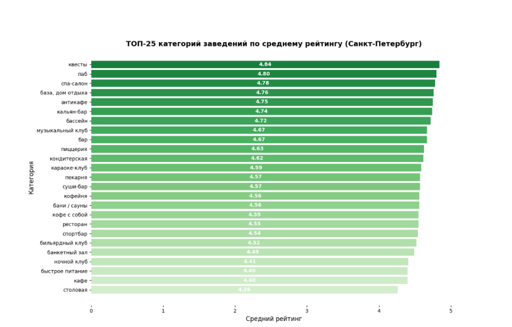 - Посетители выше всего оценивают квесты, пабы, спа-салоны, базы/дома отдыха и антикафе — их средние рейтинги близки к максимуму (4,75-4,84).