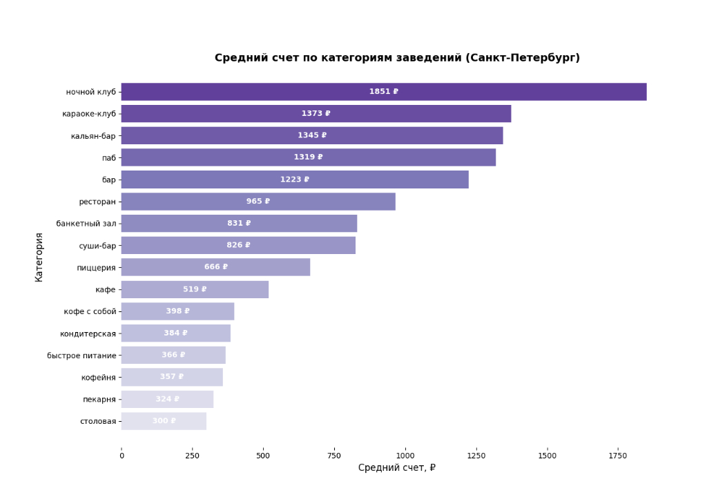 В Санкт-Петербурге самый высокий средний чек у ночных клубов (≈1850 ₽), далее идут караоке- и кальян-бары, пабы и бары (≈1200-1400 ₽). Рестораны находятся в среднем ценовом сегменте (около 965 ₽), немного ниже — банкетные залы и суши-бары (≈830 ₽). Более массовые форматы — пиццерии и кафе — имеют средний чек порядка 500-700 ₽. Минимальный чек у заведений быстрого обслуживания: кофе с собой, кондитерских, точек быстрого питания, кофеен, пекарен и столовых (≈300-400 ₽).