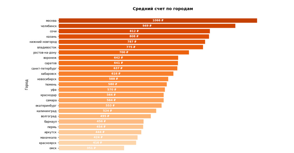 В целом по стране средний чек колеблется от 350 до 1 000 ₽. Москва остаётся безусловным лидером — 1 066 ₽, отражая характер столицы как премиального рынка. Челябинск неожиданно оказался на втором месте (949 ₽), что свидетельствует о смещении структуры заведений в сторону среднего и высокого сегмента. На этом фоне высокий чек Сочи закономерен: туристическая экономика формирует спрос на заведения более высокого уровня.