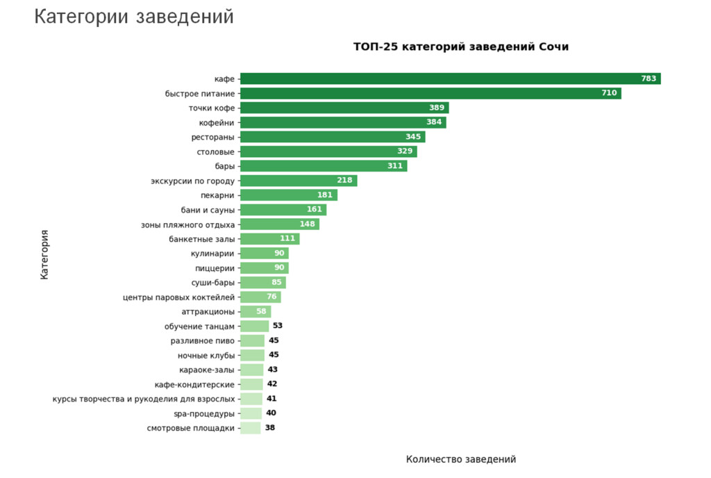 ТОП-25 категорий заведений Сочи в основном состоит из заведений питания, при этом доля развлекательных, пляжных, экскурсионных и оздоровительных форматов заметна, но по количеству объектов значительно меньше, чем у кафе, фастфуда и кофеен.