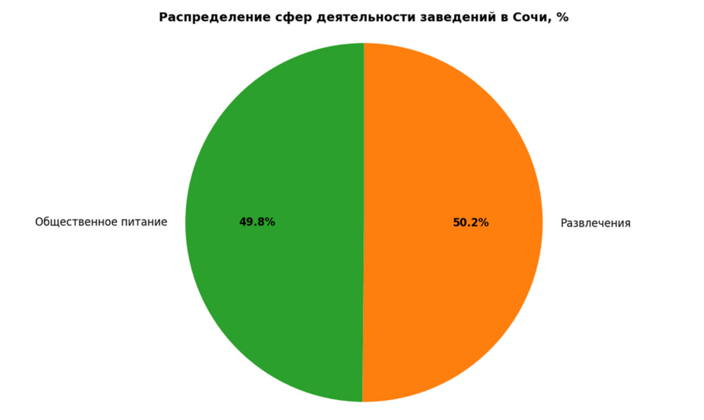 В Сочи сферы общественного питания и развлечений представлены практически поровну: на долю развлечений приходится 50,15% заведений, на долю общественного питания — 49,85%. То есть рынок фактически сбалансирован между досуговыми и пищевыми форматами с небольшим перевесом в пользу развлечений.