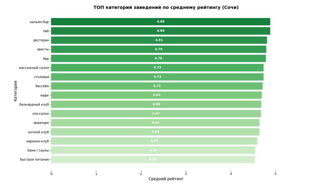 Посетители Сочи выше всего оценивают кальян-бары и пабы (4,88), а также рестораны, квесты и бары (4,79-4,81). Чуть ниже, но по-прежнему очень высокие оценки у массажных салонов, столовых, бассейнов, кафе, бильярдных клубов, спа-салонов, аквапарков и ночных клубов (4,64-4,73). Относительно менее высоко воспринимаются караоке-клубы, бани/сауны и особенно заведения быстрого питания (4,53-4,59), однако разница с лидерами невелика, и все категории в среднем имеют рейтинг значительно выше 4,5.