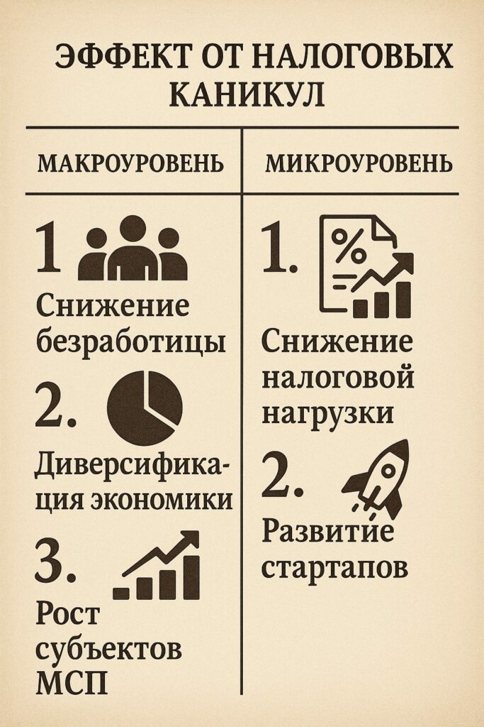 «Введение налоговых каникул способствовало увеличению регистрации новых субъектов малого бизнеса примерно на 15–20% в первый год реализации программы. Это, в свою очередь, положительно сказалось на уровне занятости в малом предпринимательстве, способствуя снижению безработицы и диверсификации экономической структуры города – в частности, в сферах услуг, торговли и информационных технологий», — объяснила эксперт.