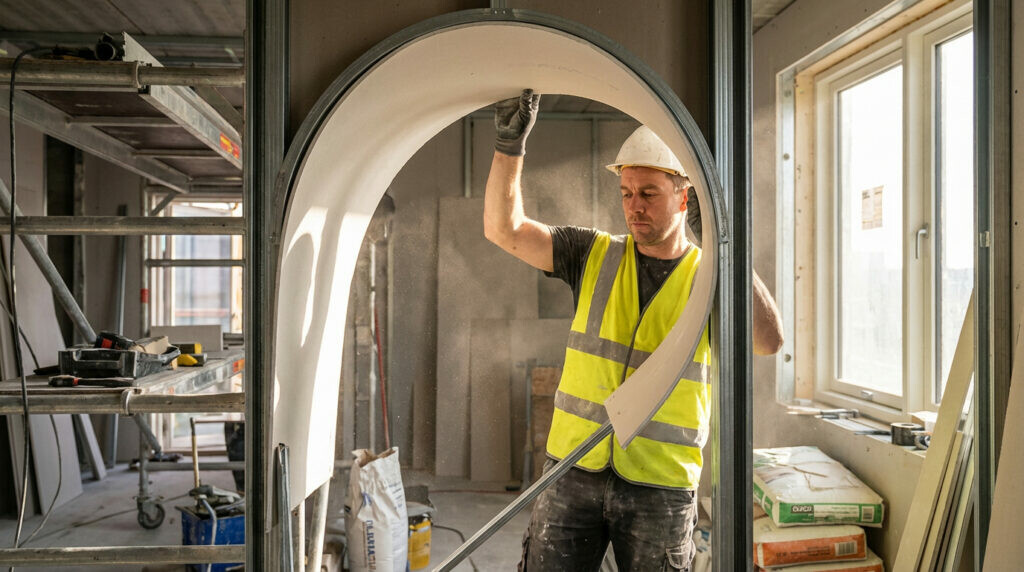 Арочный гипсокартон характеризуется уменьшенной толщиной сердечника, наличием внутренней армировки стекловолокном и способностью выдерживать значительные деформации на изгиб без нарушения структурной целостности. Ключевым параметром является минимальный радиус изгиба, который для тонких листов составляет около 30–100 см в зависимости от способа формовки (сухой или мокрой).